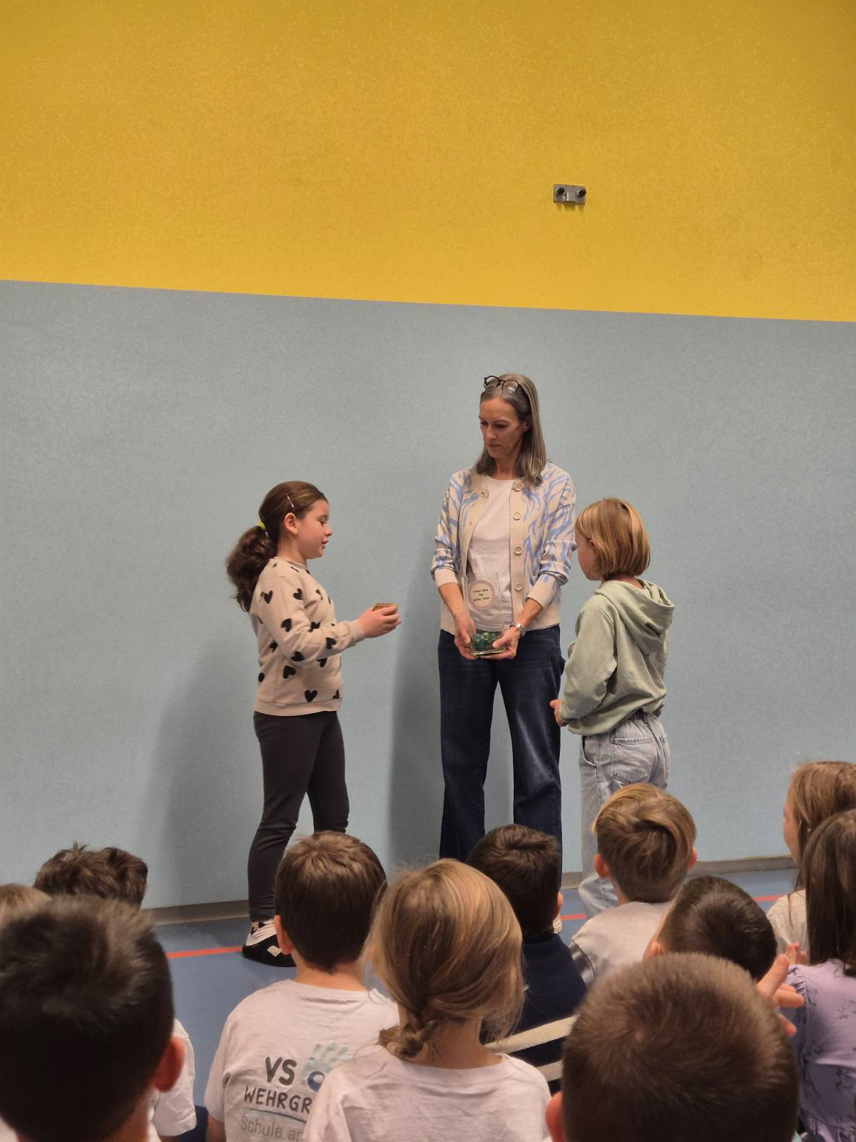Danach wurde beim Spiel „1, 2, 3 oder 4 – Zum Thema Mülltrennen“ geraten, gelacht und gelernt. ♻️ Wer wusste wohl, in welche Tonne der Apfelbutzen gehört? Und wer weiß – vielleicht gibt es ja für die eine oder andere Klasse Murmeln, wenn das Mülltrennen besonders gut klappt! 🌍✨